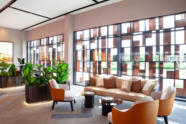 Inside, natural materials like wood create a warm and inviting atmosphere, encouraging visitors to explore the space. Large windows allow sunlight to filter through the custom façade, creating dynamic shadow patterns on the floor. The retail kiosks, inspired by tropical vernacular architecture, incorporate natural materials and colored vent blocks, enhancing the cohesive experience for visitors while allowing breezes to flow through the corridors.